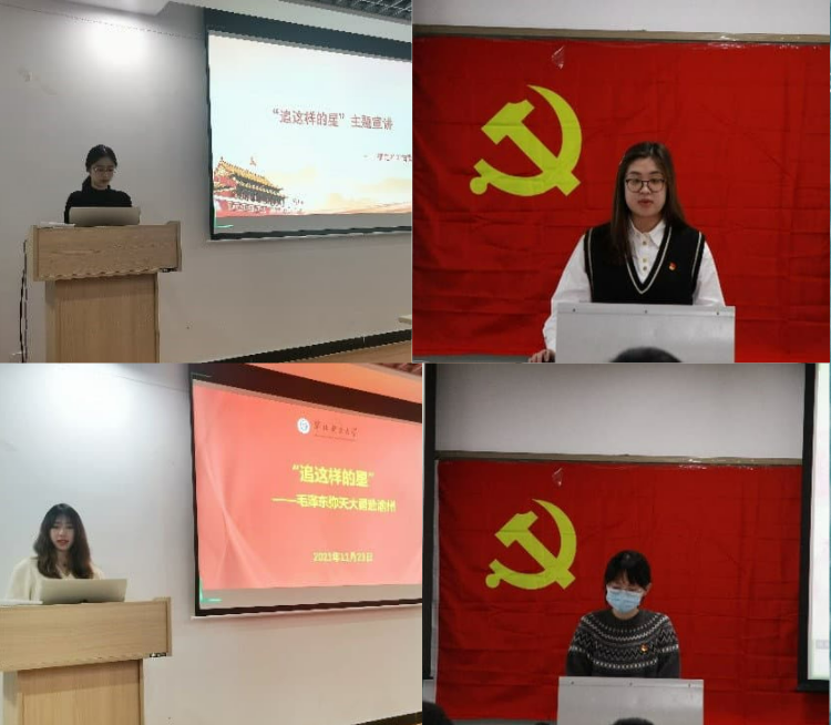 研电2101班党支部甘繁欣、陈昱冰和新材硕2102班党支部王茜华、武爱多以“追这样的星”为主题,进行了宣讲。她们深情讲述了海盐籍革命烈士朱聚生、七一勋章获得者艾爱国、伟大领袖毛泽东以及材料学之父师昌绪的榜样故事,表明了这些“星”是我们真正该追的“星”。