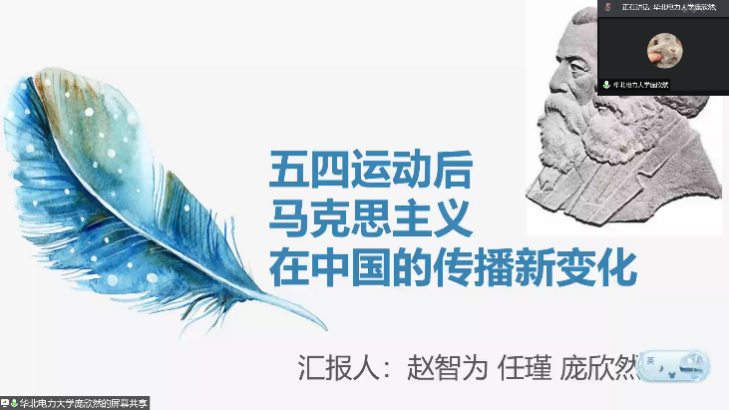 五四运动促进了马克思主义在中国的传播及其与中国工人运动的结合,中国无产阶级从此开始登上政治舞台。人文与社会科学学院赵智为、任瑾、庞欣然同学作了题为《五四运动后马克思主义在中国的传播新变化》的读书分享。他们着重介绍了五四运动对于马克思主义在中国的传播的重要性,从五四运动的背景、作用和意义三个方面,详述了五四运动后马克思主义在中国的发展历程。并号召当代青年应担起当代中国马克思主义再传播的历史使命。