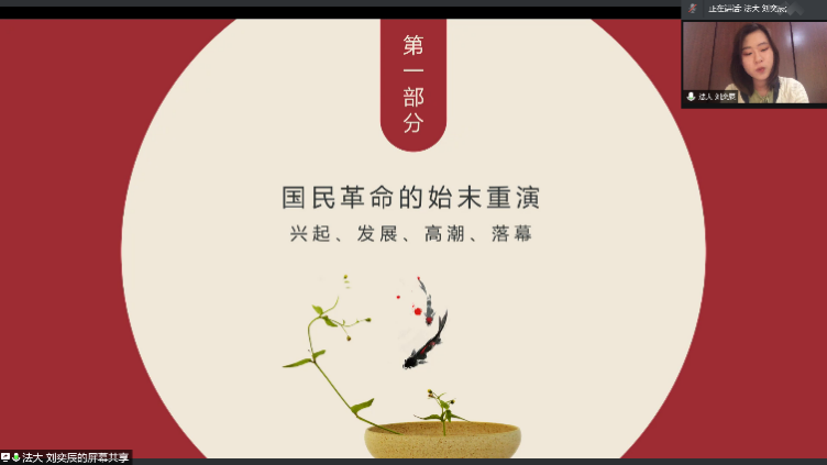 1924—1927年,一场以推翻帝国主义在华势力和北洋军阀为目标的革命运动,似滚滚洪流席卷中国大地。最后,由中国政法大学国际法学院刘奕辰同学作题为《国民革命背后的浮沉世纪》的读书分享。她细致讲述了国民革命的始末重演和历史溯因,结合多方面文献,深度解读了国民革命的现实意义,提出当代青年应始终贯穿为实现中华民族伟大复兴而奋斗的主题,号召当代青年为实现中华民族面对的两大历史任务而奋斗,告诫同学们应该居安思危,总结国民革命的现实意义,走好中华民族的现代长征路。