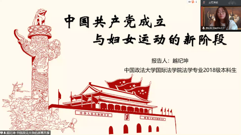 中国共产党的诞生对中国妇女运动也产生巨大影响,将领导妇女运动作为重要任务之一。中国政法大学国际法学院越纪坤同学作了题为《中国共产党成立与妇女运动的新阶段》的读书分享。她详细介绍了中国共产党的诞生历程,并从历史发展的趋势下阐述了中国共产党诞生的必然性。解读了中国共产党的诞生如何将妇女运动推向新阶段,并结合视频介绍了妇女运动的影响。中国共产党将妇女运动纳入反帝反封建运动的轨道,为中国妇女解放乃至中华民族的解放提供了强大的助力。