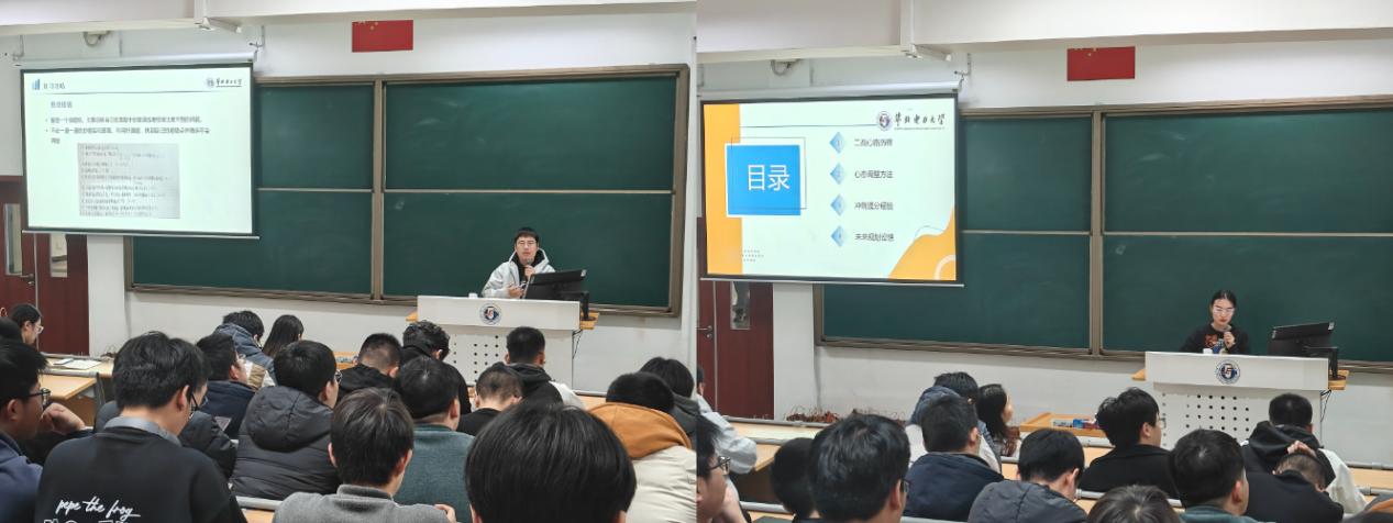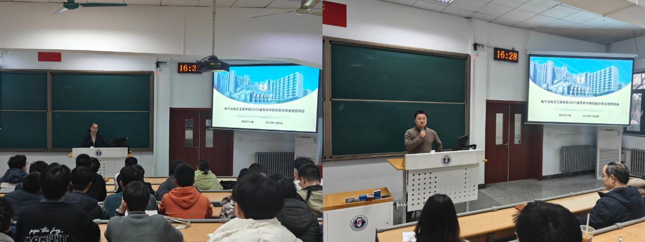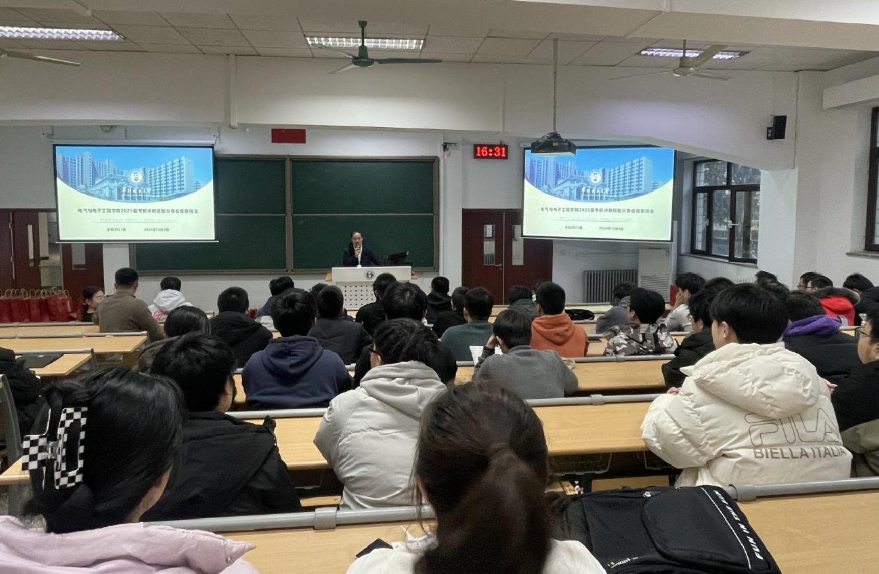 两位优秀学生代表随之分享考研冲刺经验。学院E先锋师生联合党支部刘佳文为大家分享了心态的调整方法,作息、环境、心理调节全方位覆盖,为学子驱散阴霾、鼓舞内心;同时也鼓励考生们为不同结果铺就前行之路,助学子从容应对挑战、坚定逐梦步伐。研电2408班闫腾分享了自己411分初试的冲刺攻略,从冲刺阶段每日规划、学科攻坚到错题整理、疑问解答,条分缕析,切中要点。