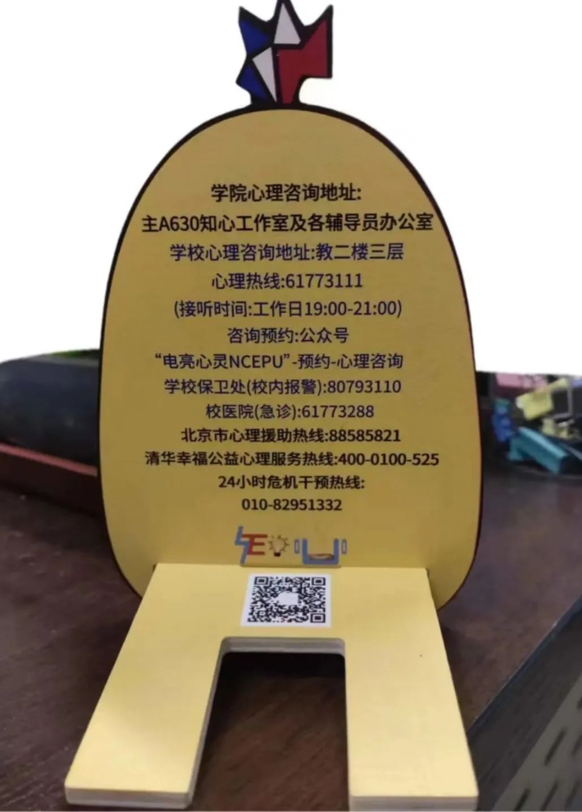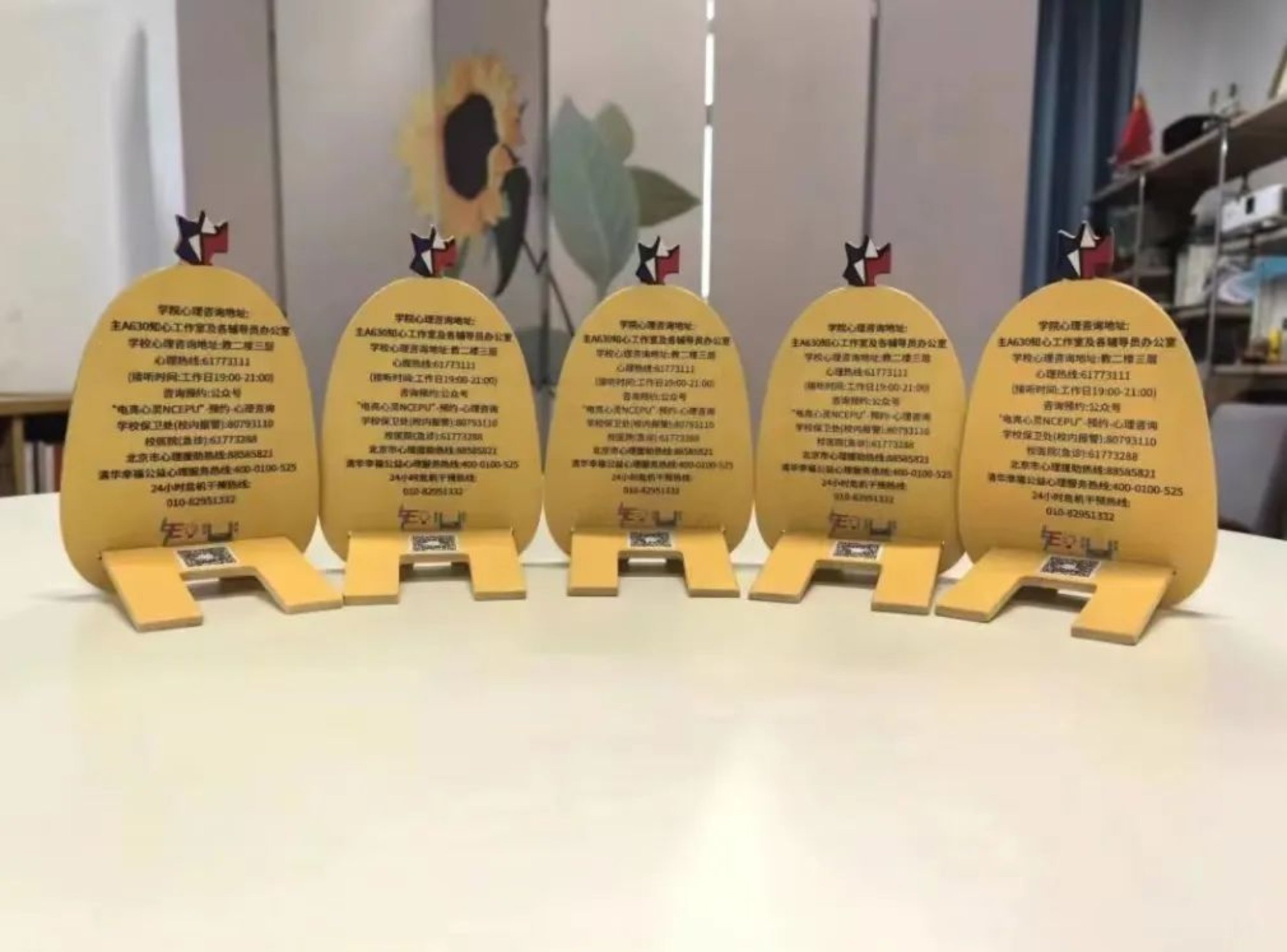 手机支架正面印制有“beat365在线体育官网登录入口”“德才兼备、知行唯实”的字样,这不仅是对学院精神的传承,也是对师生们的⼀种鞭策和鼓励。通过这种方式,希望师生们能够时刻铭记学院的教育理念,努力成为堪当民族复兴大任的时代新人。⽀架背面印制有心理咨询室地址方式等详细信息,这是对师生们心理健康的⼀种关怀和提醒。在面对学习、生活压力时,希望⼤家能够及时寻求⼼理帮助,保持⾝心健康。小电鸡手机支架采用木质环保材料制作,既符合环保理念,也体现了学院对可持续发展的追求。我们希望能够引导师生们关注环境保护,共同为可持续发展贡献力量。支架特别定制了“吃瓜鸡”、“读书鸡”、“可爱鸡”、“博学鸡”和“干饭鸡”五种款式,让大家的手机支架充满个性!无论是在图书馆、教室还是宿舍,小电鸡都能为大家提供方便。希望它可以守护大家的健康心态,陪伴大家度过每一个快乐时刻!
