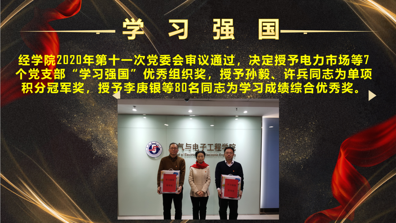 为表彰先进、树立典型,进一步激励学院教职员工加强理论学习,投身本科教学,多出科研成果。学院授予刘向军、郭春义、詹阳、徐衍会、刘宝柱、文俊、李庚银、李岩松、樊冰、黄少锋等10位教师课堂教学优秀奖,授予齐波、王增平、崔翔、刘念、胡俊杰、刘崇茹、刘文霞、周振宇等8位教师科研突出贡献奖。同时对“学习强国”学习情况予以表彰,授予电力市场等7个党支部优秀组织奖, 授予孙毅、许兵单项积分冠军奖,授予李庚银等80名同志学习成绩综合优秀奖。