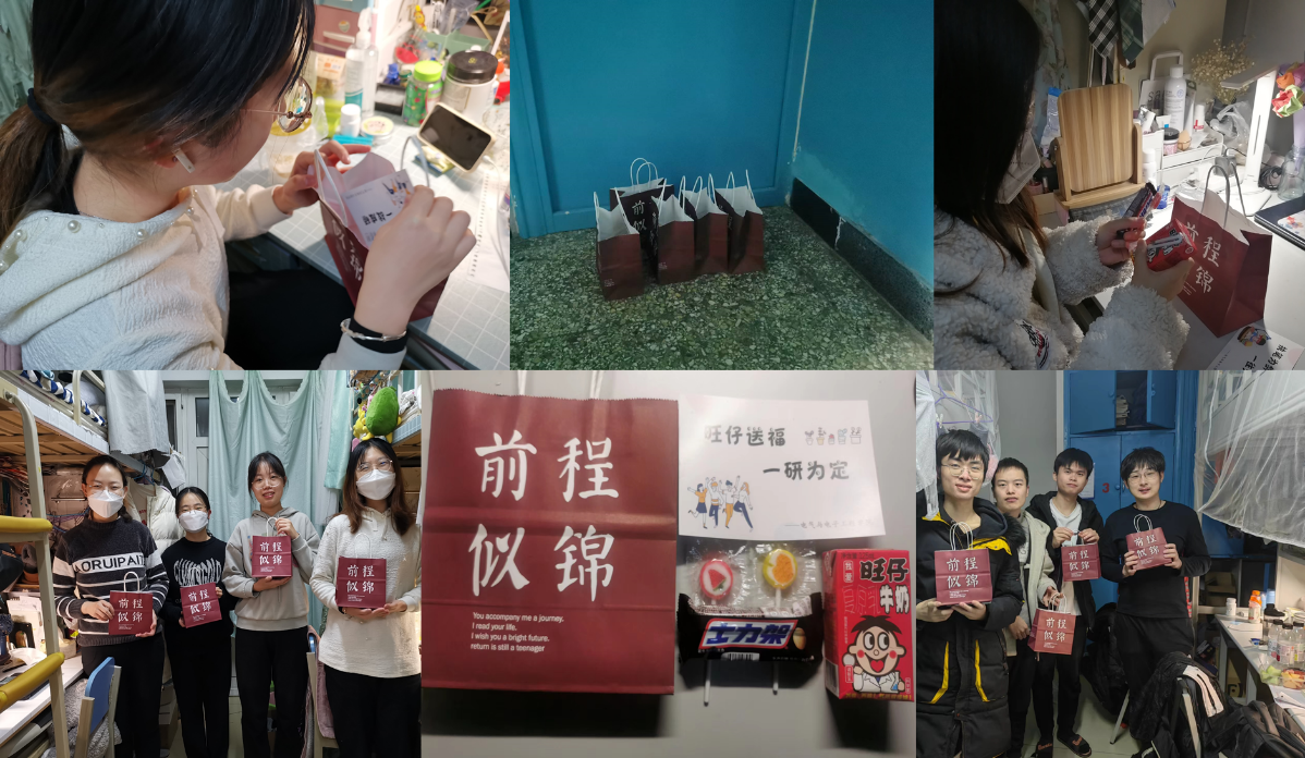 学院从寓意、新意等多角度考虑,准备了礼品,包含士力架、旺仔牛奶、棒棒糖,意在祝福大家势在必得、好运相伴、金榜题名,同时学院还特别定制了5类加油卡片鼓舞考研学子。准备过程中,学院以守护同学们的健康为第一原则,不光对物资进行消杀,分装全程要求佩戴手套和口罩,还由“大白”将大礼包送到相应宿舍楼下分发,严谨设计流程、严格落实要求,确保同学们安全收到祝福。