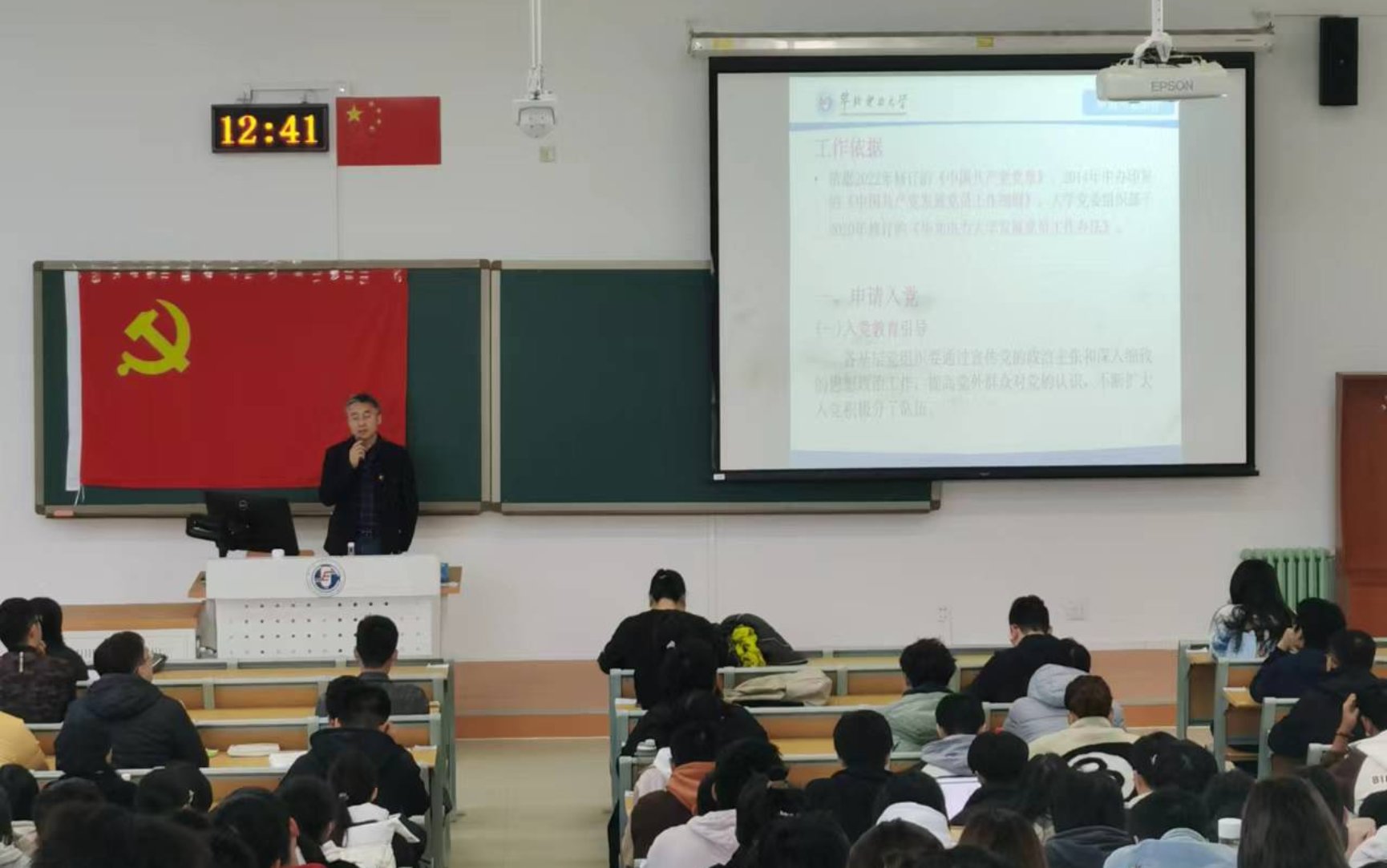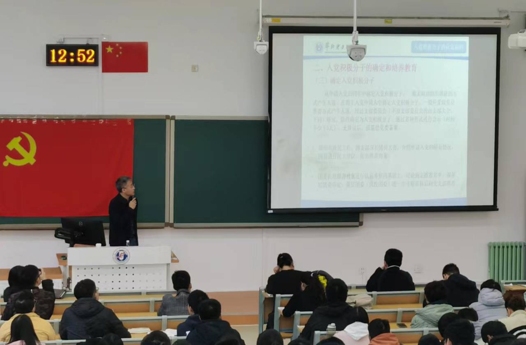 张宝良首先向同学们介绍了学校党员发展工作的依据《中国共产党章程》、《中国共产党发展党员工作细则》和《beat365在线体育官网登录入口发展党员工作办法》。随后他阐述了申请入党需要满足的五个条件以及发展党员的规定和程序。为积极分子学员总结梳理入党需要的四个阶段,详细讲解发展党员每个阶段的流程和要求,和如何撰写入党申请书等材料的格式和要求。