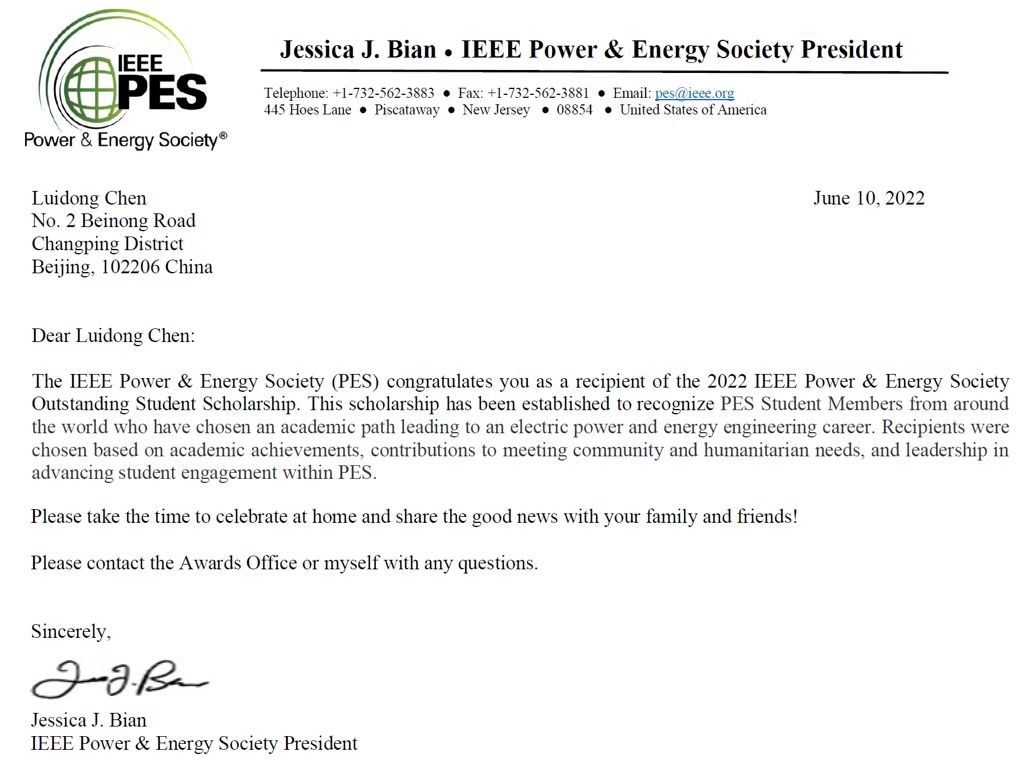 近日,从IEEE电力与能源学会(IEEE Power & Energy Society,PES)传来喜讯,beat365在线体育官网登录入口硕士生陈刘东因其优异表现获得2022年杰出学生奖学金(IEEE Power &Energy Society Outstanding Student Scholarship),成为我校首位荣获该奖项的学生。