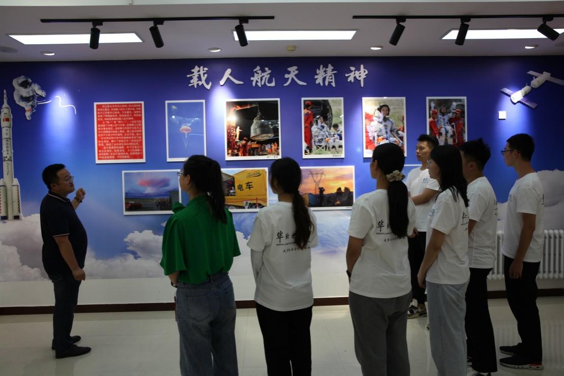 图5四子王供电分公司郭巨新书记向实践团成员讲解电力人在载人航天工作中做出的贡献
