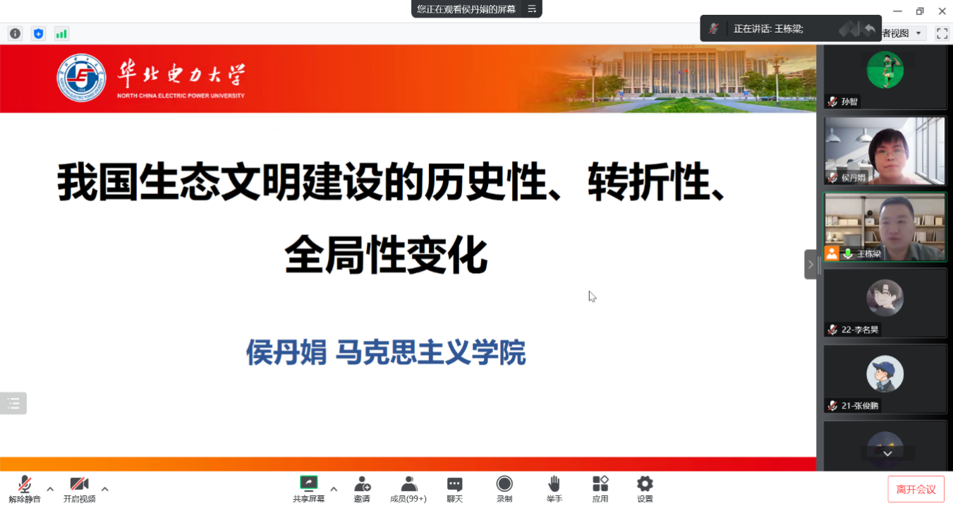 侯丹娟紧扣党的二十大报告原文,深刻把握习近平生态文明思想的核心要义,从为什么要开展生态文明建设、我国怎样开展生态文明建设、生态文明建设的意义与价值等三个方面系统阐释了党的十八大以来我国生态文明建设取得的历史性成就、发生的历史性变革。侯丹娟分别从全球视角、国内视角介绍了生态文明建设面临的诸多矛盾与挑战,从国土绿化、雾霾治理、生物多样性保护、能源转型、生产生活方式变革、环境立法等6个维度介绍了美丽中国建设迈出的重大步伐,并结合学院学生的专业特点,着重介绍了我国能源结构现状及能源转型的优势与挑战。整场报告聚焦于党的二十大报告精神和习近平新时代中国特色社会主义思想研究的重大理论关切,深刻阐释了“努力建设人与自然和谐共生的现代化”的宏大立意、丰富价值和深远影响。
