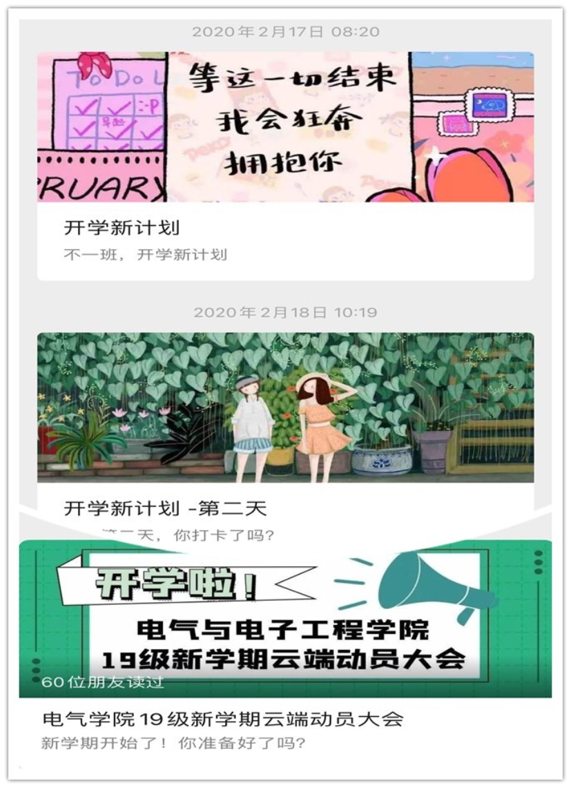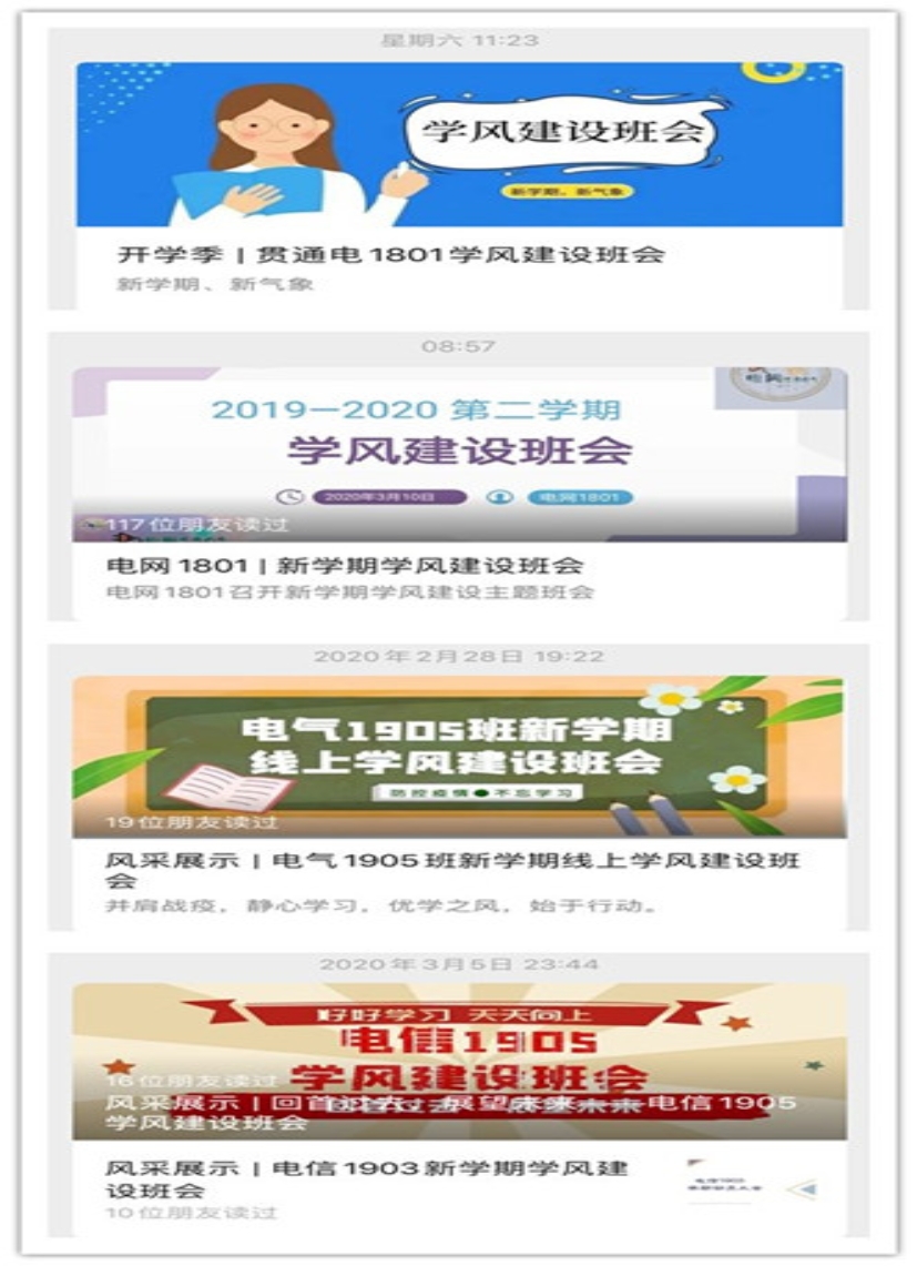 “停课不停学,防疫不妨学”。电气学院各年级将学风建设作为疫情防控期间的重点工作,开展了一系列形式多样、成效显著的促学助学活动,助力学生调整状态、收心归位,更好地适应线上教学,规划科学健康的学习生活。其中,电气1801班聚焦特殊时期同学们的不同需求,推出“开学新计划”特别企划,通过“课程学习”、“艺术拓展”、“运动健身”和“好书推荐”等多个模块,用轻松愉悦的形式向同学们提供特殊时期的学习生活指南,实现自主学习与身心健康双促进。2019级召开“新学期云端动员大会”,辅导员与各班学生干部共同回顾上学期的成绩与不足,横向对比分析各班成绩与表现,明确优势,找到差距,同时规划新学期的工作,做到“一班一策”助力线上教学,完成“停课不停学”期间的各项学习任务。各年级各班级召开线上学风建设主题班会,班主任带领学生进行学期总结、成绩分析、经验交流、制定计划等等,营造勤学上进的学习氛围。