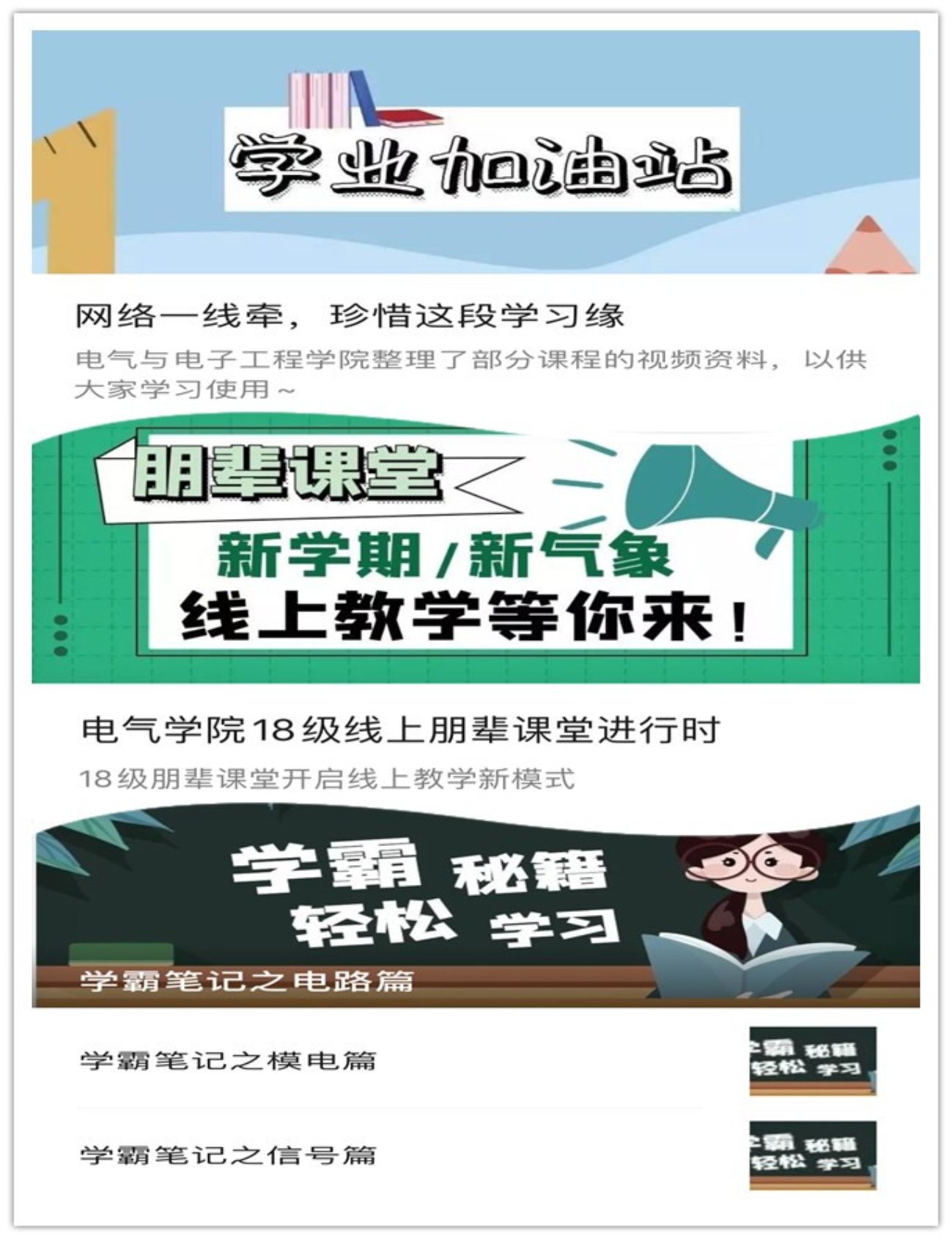 开学推迟,学业不滞。特殊时期,有同学们的地方就是一线,有需求的地方就是战场,电气学院以关心学生学业为出发点,以继续大力帮助学业上有困难的学生为重点,依托“泰山”工作室,迅速组建线上朋辈教研室,采取个性化帮扶措施,展开专项帮扶工作,启动线上朋辈课堂。为充实学业辅导力量,本科2017级和2018级积极宣传,广泛动员,开展朋辈课堂辅导员招募工作,以“小我奉献大我”为主题的招募计划,得到很多热心于学业辅导同学的积极响应。为帮助同学巩固所学知识,积极搜集课程视频资料,提供慕课资源。为解决学业辅导“新问题”,“泰山”工作室加强人文关怀,为减小中西部(尤其新疆)地区同学因时差造成线上学习效果受到的影响,特别遴选成绩优异、表达能力强又富有爱心的同学,与中西部地区同学结成“一对多”长期互助关系,分享课程学习笔记,交流学习心得,助力中西部同学学业不落后。经过近一个月的实践,已构建起“课堂导学-慕课助学-朋辈促学”三位一体的学业辅导模式,为疫情防控期间学院学业帮扶和学风建设工作提供了有力保障。